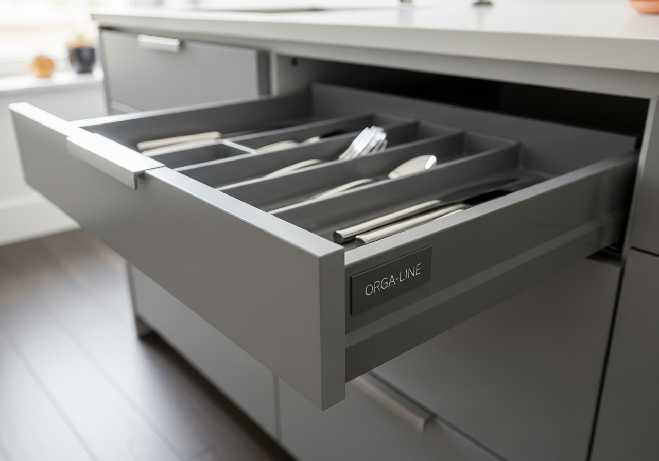 Wygląd szuflady możesz łatwo spersonalizować. Oprócz koloru boków możesz wybrać wersję z pojedynczym lub podwójnym relingiem. Prawdziwe możliwości dają jednak systemy organizacji wewnętrznej, takie jak ORGA-LINE. To zestawy przegródek i pojemników, które pomagają utrzymać idealny porządek w środku – koniec z latającymi po szufladzie przyprawami czy sztućcami.